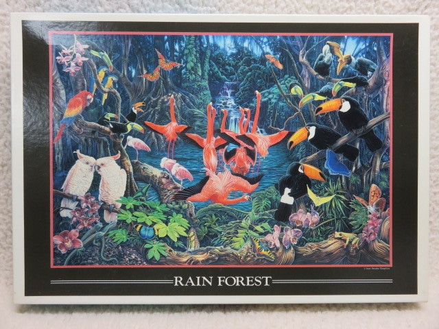 ゆうパック送料無料! 昭和レトロ 玩具 古いジグソーパズル 1000ピース RAIN FOREST 鳥たちの楽園 オオハシ キバタン コンゴウインコ フラミンゴ サイチョウ など カエル トカゲ 蝶々 バタフライ ヘラサギ 草花 胡蝶蘭 アマゾン ジャングル 神秘的 自然界