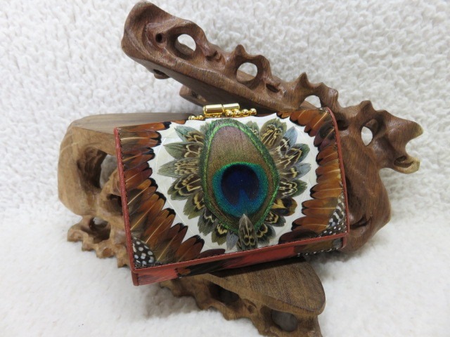 孔雀の羽根など、いろいろな種類の鳥の羽根が使われて完成したお財布です。